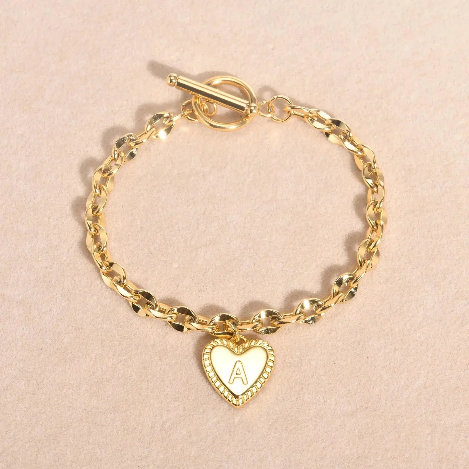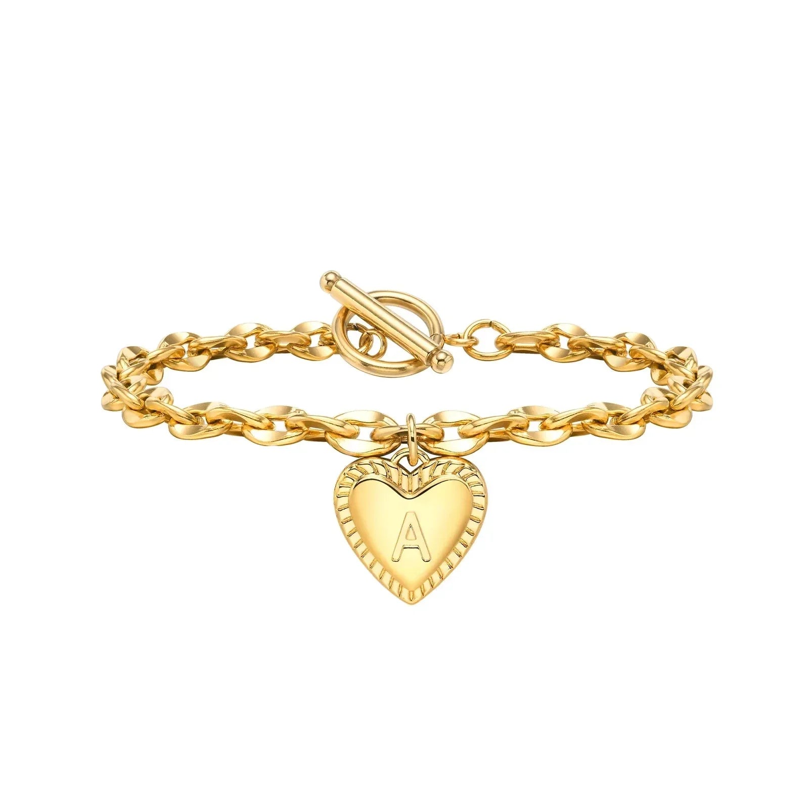 • Style: This bracelet features a delicate golden chain link design, exuding elegance and sophistication. It is secured with a circle bar clasp lock, ensuring both style and security. The highlight of the bracelet is the dainty heart pendant, which is adorned with intricate engraved pattern accents. In the center of the heart, a custom letter initial is engraved, adding a personal and meaningful touch to this already stunning piece.