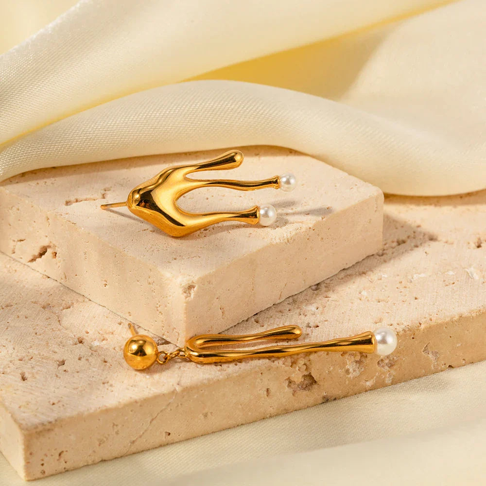 • Style: Polished golden stud earrings crafted with an artistic melted look. Each earring showcases a slightly different shape, creating an asymmetrical yet harmonious design. One earring is thinner, ending delicately with a single dainty pearl, while the other is wider, with two pearls nestled within the molten gold finish. This asymmetry adds a playful sophistication to the set, perfect for enhancing both casual and formal outfits.