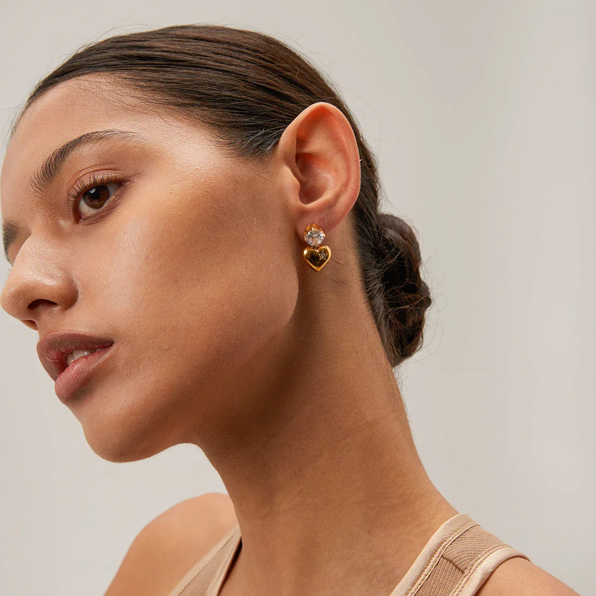 • Style: These elegant earrings feature a radiant diamond stud at the top, delicately suspending a polished golden heart that sways with every movement. The heart is adorned with a shimmering diamond set within an intricately embedded star pattern, creating a subtle yet eye-catching design that exudes sophistication. The combination of diamonds and the gentle golden heart shape makes these earrings the epitome of elegance and femininity, ideal for both everyday wear and special occasions.